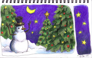 We were in San Fransisco this weekend, attending the wedding of one of Clint's coworkers. I took my trusty sketch book with me, for doodling as usual. After I drew the snowman on Friday, Clint inspired the series of sketches by asking, "What would happen if your Snow Bunny ran into your snowman...he has a carrot for a nose..." You may fill in the details your self.